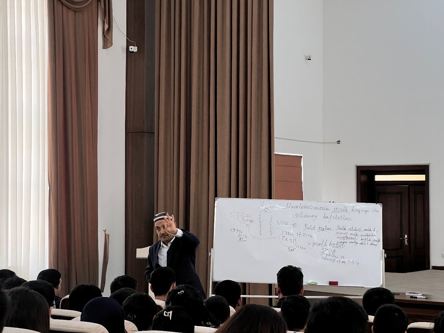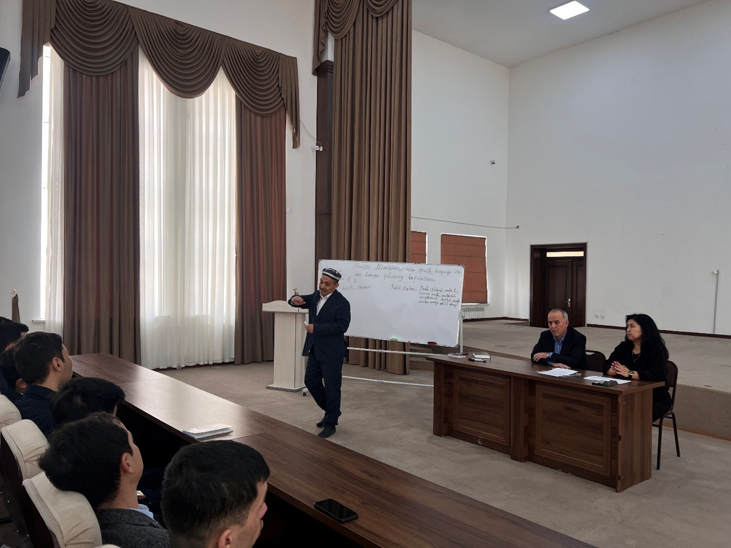 Mashg‘ulot jonli tarzda, auditoriyaning bevosita ishtirokida, kreativ ohang va shaklda amalga oshirilib, unda asosiy fokus mamlakatimizda mulk islohotlarini amalga oshirishning zarurati, mulk, mulk huquqi, xususiy mulk, mulkdorlik, xususiylashtirish va uning oqibatlari (xususan, еrlarni xususiylashtirish), boylik, mulk huquqini amalga oshirish shartlari, mulkiy huquq kafolatlari kabi masalalarga qaratildi. Konstitutsiya (1992/2023), GK va FK normalari, mulkchilik sohasidagi qonunlar (“O‘zbekiston Respublikasida mulkchilik to‘g‘risida” / “Xususiy mulkni himoya qilish va mulkdorlar huquqlarining kafolatlari to‘g‘risida” (2012) qiyosiy tahlilga tortildi.